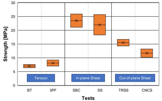 The average values of strength with respect to the specimen geometry are presented in Figure 15. The strength was measured at a loading rate of 1 MPa/s. The average tensile strength, in-plane shear strength, and out-of-plane shear strength were 7.55, 22.75, and 13.6 MPa, respectively. The results indicate that the maximum strength was attained in the in-plane shear test.