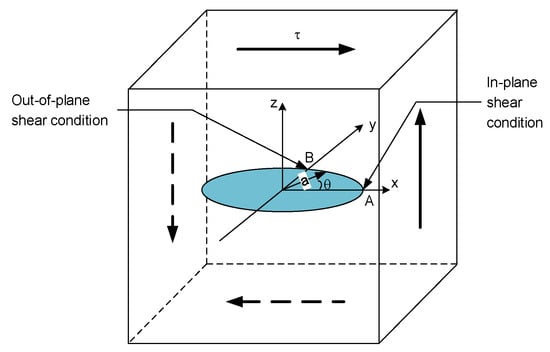 The tensile strength was shown to be lower than the other strengths. Furthermore, the out-of-plane shear strength was approximately 60% lower than the in-plane shear strength, whereas the values of the in-plane shear strength and cohesion (22.7 MPa) were very close. Cohesion is defined as the shear strength of the Mohr–Coulomb failure criteria without a confining stress. Fracture formation in rock structures typically involves in-plane shear, out-of-plane shear, and a mixed mode loading system. Although it is possible for a rock mass to undergo simple sliding loads due to the complex geometry and random crack orientation within the rock structure, crack growth typically takes place in the presence of mixed-mode loading [27]. X-ray tomography can help to understand the crack formation under stress [28]. For instance, Figure 16 illustrates a penny-shaped crack placed under shear loads in an infinite medium [29]. In-plane shear loads are placed on the edge of the x-axis of the penny-shaped (point A), whereas the edge of the y-axis of the penny-shaped crack (point B) is subjected to out-of-plane shear loads.