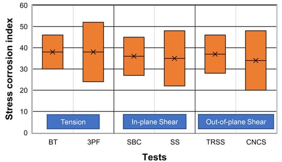 Figure 17 presents the variation in stress corrosion index for the different tests performed in this study. According to the experimental results, the stress corrosion indices (n) were highly similar irrespective of the loading configuration and the specimen geometry. It was not affected by the loading configuration, including tension, in-plane shearing, or out-of-plane shearing.