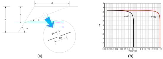 Figure 18 shows an example of time-dependent slope stability model to predict time to failure [18]. The same material and slope parameters are maintained and only different stress corrosion indexes of n = 15 and n = 20 are applied. The time to failure of rock slope is susceptible to stress corrosion index. The time to failure of the rock slope at the stress corrosion index n = 20 is approximately 145 times longer than that at the stress corrosion index n = 15.