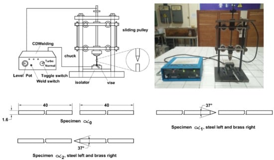 The independent variable of this research is a different surface preparation, which is described in the lower part of Figure 1 and called α0, α1, and α2. In the figure, for the steel that is always on the left side, or also termed specimen α0, both surfaces are flat, while for specimens α1 and α2, the steel and brass are sharpened, respectively. It should be noted that, for the sharpened surface at two tips the good joint was hard to be obtained and always produced misaligned components. Thus, there is no specimen with a sharpened tip for both metals. For all surface combinations, the steel, which has better weldability, was always gripped at upper chuck to obtain better results. Using all the described methods, welding parameters were considered to be constant, and the only altered parameter is the surface preparation, which is the only independent variable in this article.