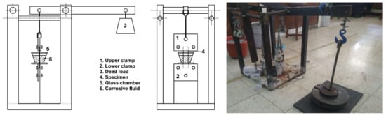 After the joints were obtained, the next step was the SCC corrosion test, which is the dependent variable of this article. The focus for the dependent variable is the stress corrosion threshold, which describes the maximum stress, which is defined as the maximum allowed exerted stress where the SCC is assumed to not occur. Figure 2 shows the installation of the SCC, which was designated for this research. Figure 2 shows a sketch and a photo of the SCC apparatus. The dead load is attached at the end of the loading arm (right arm) and the applied load at the upper clamp can be counted by considering the length of each arm. The exerted tensile stress can be calculated by dividing the load by the original area of the base metal (πD2/4). The specimens, especially the interface, were dipped in the 1 Molar HNO3 solution. To obtain the SCC threshold, the load must be varied, and for each load the time to fail was recorded.