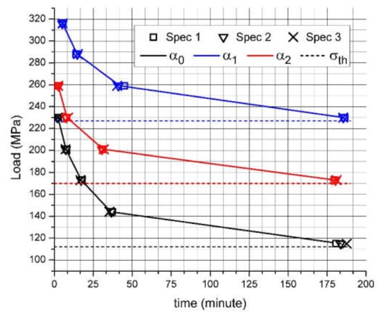 As has been explained in Section 2, the dependent variable is the time to failure for the varied load. The load at the end of the arm (see Figure 2) was varied at 8, 10, 12, 14, 16, 18, 20, 22, and 24 kg, which can be converted into the tensile load for the specimen as follows: 115, 144, 173, 201, 230, 259, 288, 316, and 345 MPa, respectively. For each variation of load, three data of time to failure were recorded. In practice, the data were recorded in hours, minutes, and seconds, but for easy data processing they are tabulated in minutes. As an example, two hours, ten minutes, and thirty seconds are tabulated as 120 minutes, 10 minutes, and 0.5 minutes, which equals 130.5 minutes. The complete recorded data are presented in Table 3 that shows the time to failure for varied surface preparation and load when the joint is exposed to the corrosive environment. When a load of 24 kg (345 MPa tensile stress) was applied, the welded joints failed immediately, since the load exceeded the ultimate strength of all joints. The α1 specimen revived around 5 minutes when 22 kg (316 MPa tensile stress) was applied whilst failure took place directly for two other specimens: α0 and α2. The 22 kg load roughly proved that the α1 specimen was the strongest joint by means of SCC threshold. The time to fail for the α1 specimen was obtained from three of α1 specimens to provide statistical acceptable data. The 316 MPa was considered to exceed the ultimate tensile strength of α0 and α2 specimens. When 250 MPa was applied, only the α0 specimen broke instantaneously while the others stood for a certain time, which more or less proved that the modified surface preparation improved the strength of the indigenously flat interfaces welded joint.