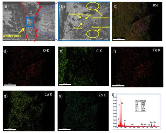 The SEM/EDS evaluation of the welded interface of the α0 specimen is shown in Figure 5. Figure 5a shows the interface with a 50x magnification. Figure 5a also shows the position where the EDS was applied. The position where SEM/EDS was exhibited in the joint between mild steel and brass is shown in Figure 5b. It can be seen that there are porosity and fibrous networks, which initiate fracture at the welded joint. The fibrous network indicates the ductile fracture []. The local pit corrosion is spread over the interface. The existence of the O element indicates the oxidation of the welded joint when exposed to the HNO3 solution. The increasing C is able to promote local pitting corrosion. Figure 5d–g shows a mapping of C, O, Fe, Cu, and Zn elements. It should be noted that Fe-C is the major element of mild steels whilst Cu and Zn are the dominant elements of brass. In the interface, the elements of Cu and Zn increase, which indicates that the brass deliquesce easier than steel. This is plausible since the melting point of brass is lower.
