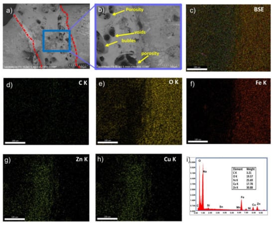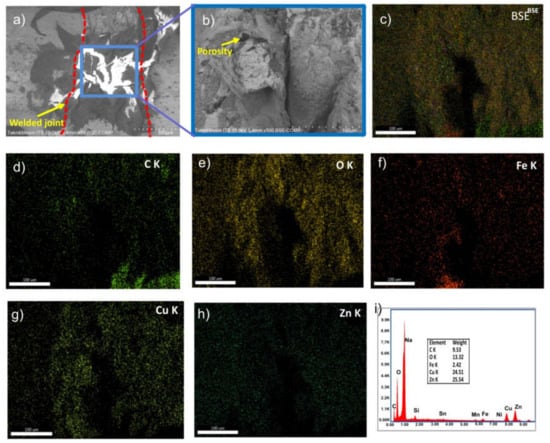 (a)The micrograph of α0 using SEM with a 50x magnification, (b) 300x magnification, (c) color composite of SEM/EDS maps (backscattered electron), (d) map of O, (e) map of C, (f) map of F, (g) map of Cu, (h) map of Zn using EDS., (i) Elements composition of welded joint.