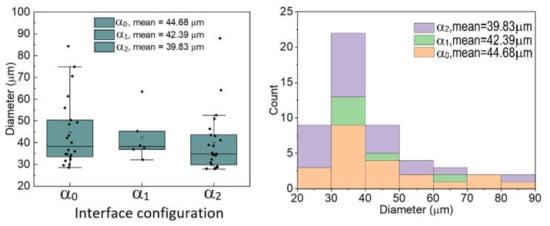 The quantitative analysis of pores was carried out using Phenom Phorometric analysis which is attached as Supplementary Materials of this paper. The mean pore size of α0, α1, and α2 are 44.7 μm, 42.5 μm, and 39.8 μm, respectively. Many pores are found in the α2 specimen with the lowest diameter. The distribution can be seen in Figure 8. α0 exhibits 22 pores with an average pore area ratio of 9.09%, calculated for one image. Observing the α1 image, six pores with an average pore area ratio of 1.13% are found, calculated for one image; whilst 23 pores are found for α2 with an average pore ratio of 4.96%, calculated for one image. The higher pore area ratio indicates the weaker welding joint. The α0 specimen shows a big amount of porosity since no melting existed at the steel and brass interfaces. Gaps on the interfaces take place in pore forms. The existence of a gap indicates that there is trapped air that forms visible pores. Big porosity on the welded joint enables a long crack in form of a line, and the product of corrosion spread over the joint surface. Based on microphotograph only, the strongest joint may be provided by the α1 specimen since this joint has the smallest porosity ratio. This confirms the macrophotograph of Figure 4 and the SEM/EDS analysis of Figure 8. On the α2 specimen, more porosity can be seen compared to α1. Although melting takes place at the interface of steel and brass, higher porosity and impurity decrease the strength of the joint. The decreased diameter and lower melting point of brass produces more brass deposit on α2 than on α1. In short, it can be said that the result of the SEM/EDS and porosity analysis supports the results of the SCC test: the strongest joint is obtained from the α1 configuration followed by α2 and α0, sequentially.