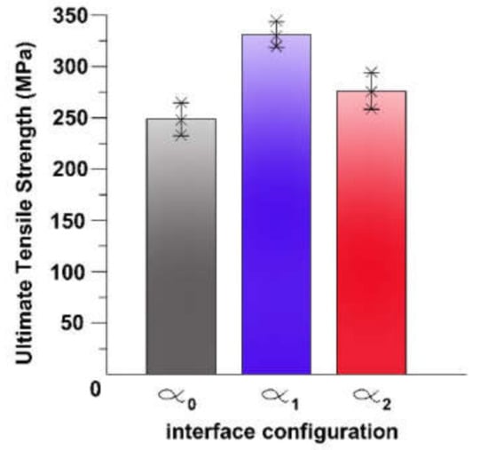 To prove the better coalescent of α1, we roughly obtained the tensile strength of the joint. Using the SCC apparatus (Figure 2), the ultimate tensile strength of the joint can be approached. The dead load at the end lever was increased gradually until the joint was broken. The ultimate tensile strengths were then presented in Figure 9. Three specimens were tested for each configuration. By this simple approach, the strongest joint was α1 followed by α2 and α0, consecutively, which supports all previous discussions.