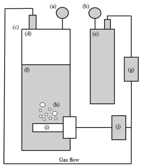 Schematic view of a nanobubble Generator [16]. (a) Pressure gauge (air pressure in water tank), (b) pressure gauge (air pressure in air tank), (c) water tank, (d) air, (e) gas tank, (f) water, (g) pressure gauge (outflow), (h) bubble, (i) filter, and (j) pressure gauge (inflow).