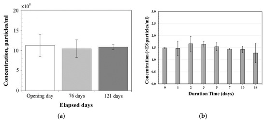 The stability of the nanobubbles was confirmed over two months. For the experiment, stable 14-day-old nanobubbles were used [15]. Figure 3 shows how long nanobubbles are maintained. Figure 3a confirms the persistence by making nanobubbles in gasoline, and the results confirm that the nanobubbles are maintained for 120 h. Figure 3b shows a comparison of the changes in the concentration of the nanobubbles over 14 days, and it is the same as the nanobubbles used in this experiment. After day 14, approximately 15% of the nanobubbles were lost. Thus, the long-term existence of the nanobubbles was confirmed.