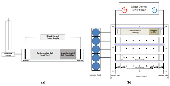 A laboratory test was carried out to apply an electrokinetic remediation process to soils contaminated with copper. The same soil specimens from the batch test, sand and clay, were used to construct contaminated and uncontaminated soil. The copper-contaminated solution was prepared, using copper nitrate powder (Cu(NO3)2) in DW. Then, 500 ppm of copper was contaminated to soil, at a water content of 40%. Clay was tested immediately after contamination. Sand was used as a simulation of the ground condition, and it was contaminated with 500 ppm of copper solution and dried in the shade. Dry sand contaminated with copper was installed with the maximum consolidation and tested. The contamination concentration of copper was referred to as the Korea Standard. To identify the remediation characteristics, different conditions of soils with Jumunjin standard sand and clay were used. In addition, nanobubbles identified as an appropriate enhancer from the batch test were placed into a Mariotte bottle and injected constantly. The experimental device designed for electrokinetic remediation is shown in Figure 4. The cell and Mariotte bottle are made of acrylic, and the electrode plate used graphite. The nanobubbles were injected into the cell, using a hydraulic gradient. An electrode water tank was installed at each end of the cell, to provide unrestricted outflow of electro-osmosis during the experiments. The testers were designed to conduct five simultaneous tests. The experimental conditions are summarized in Table 4.