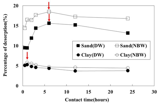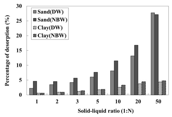Figure 5 shows the incremental desorption percentage of copper according to changes in the solid-liquid ratios of soils contaminated with copper. After agitation for 24 h, the level of desorption of the heavy metal by the nanobubbles was found to be greater in sand than in clay. The increase in solid-liquid ratios in both sand and clay also increased the efficiency with which heavy metals were removed than compared to the use of distilled water alone. However, contrary to the proportional increase of the removal efficiency of the copper to solid-liquid ratio in sand, a solid-liquid ratio greater than 1:20 in clay rendered no significant difference in the efficiency of the copper removal by DW and NBW. Taking both efficiency and economy into account, the optimal solid–liquid ratio, while using nanobubbles as an enhancer in sand, was determined to be 1:20. This finding was attributed to the comparatively larger specific surface area and zeta-potential of the nanobubbles, which is known to be advantageous for desorption and transfer of copper from the surface of particles [15,18].