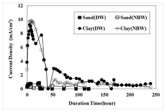 Figure 7 illustrates changes in the current density according to different types of soil. Clay (DW) corresponds to a peak current density of 9.21 (mA/cm2) at 5 h from the start of the experiment. Clay (NBW) corresponds to a peak current density of 9.81 (mA/cm2) at 8 h from the start of the experiment. Sand (DW) corresponds to a peak current density of 0.88 (mA/cm2) at 24 h from the start of the experiment, and Sand (NBW) corresponds to a peak current density of 0.74 (mA/cm2) at 5 h from the start of the experiment. Both sand and clay exhibited an initial increase, followed by a decrease in the current density. The result of all the tests tended to converge as time went by. The migration of heavy metal ions increased initially and then decreased. Han et al. [19] postulate that this might be attributable to the migration and sedimentation of the heavy metal ions.