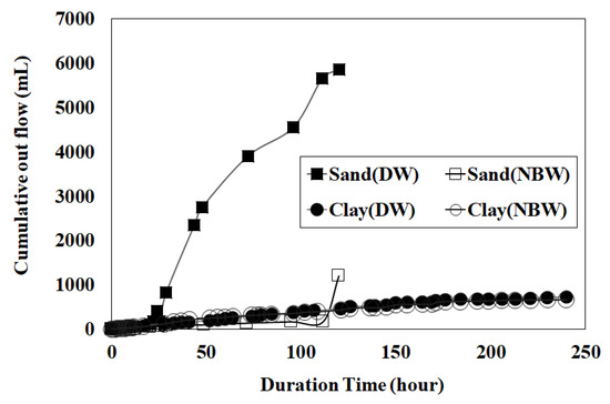 Figure 8 illustrates the amount of effluent according to the remediation time for sand and clay as part of the remediation experiment, where nanobubbles were used as an enhancer. Effluents of Clay (DW), Clay (NBW), Sand (DW), and Sand (NBW) were 729, 662, 5855, and 1198 mL, respectively. The amount of effluent from the one treated with distilled water was found to be greater than the outflow observed with the nanobubbles treatment. This was attributed to bubbles of hydrogen gas being generated at the cathode by electrokinetic remediation with nanobubbles that disturbed the discharge of the effluent. The amount of effluent from sand appeared greater than that outflowing from clay. The removal of heavy metal from sand with greater effluent discharge was found to be highly efficient. This could be attributed to the comparatively larger specific surface area and zeta-potential of the nanobubbles that resulted in remediation being more efficient.