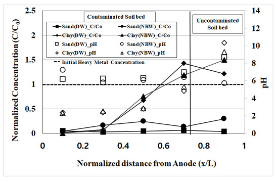 Figure 9 illustrates the concentrations of residual heavy metals and pH level measured at each position in the cell upon completion of the experiment. In the case of sand and clay, all exhibited an increased pH due to the collision of acid and base at the point of 0.75 x/L by electrokinetic remediation.