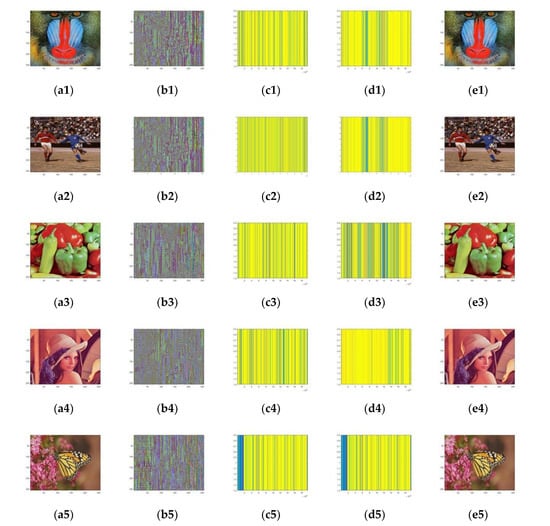 A series of simulation experiments have been carried out to verify our attacking scheme with an Intel(R) Core(TM) i5-5300 CPU 2.39 GHz and 8 GB memory capacity. MALTAB R2016b is used for the experiments. Five standard images with the size of are chosen in the experiments including ‘Baboon’, ‘Soccer’, ‘Pepper’, ‘Lena’, and ‘Monarch as shown in Figure 3a1–e1. The corresponding encrypted images are shown in Figure 3(a2,b2,c2,d2,e2). We attack the lp and diffusion using the steps in the first phase in Section 3. The retrieved permutation-diffusion images and retrieved permutation-only images are obtained as in Figure 3(a3,b3,c3,d3,e3) and Figure 3(a4,b4,c4,d4,e4), respectively. After attacking permutation in the second phase in Section 3, the restored images are obtained which have been shown in Figure 3(a5,b5,c5,d5,e5). Figure 3(a5,b5,c5,d5,e5) coincides with the original images, compared with Figure 2(a1,b1,c1,d1,e1). The recovery performance evaluation can also be made by root mean square error (RMSE). Denoting the original image I and the recovered image I’, RMSE defined as below.