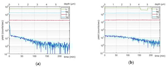 Figure 1 shows the depth profiles of 7Li, 93Nb, 16O, and 70Yb on a semilogarithmic scale giving two examples of SNMS spectra of the Yb-doped LiNbO3 samples used in this analysis. Figure 1a demonstrates that at lower temperatures, a certain amount of Yb remains in form of a thin film on the surface, indicating that the Yb reservoir has not been exhausted.