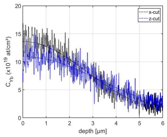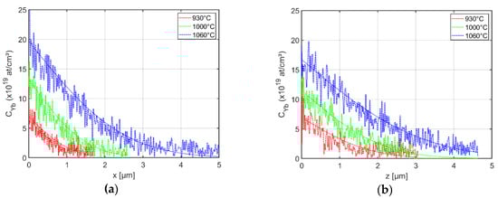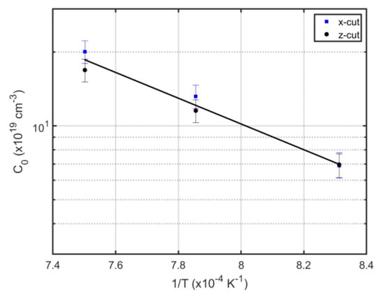 The temperature dependence of the surface concentration is presented in Figure 6. As can be seen, the measured values for the surface concentration of Yb for the three lowest temperatures indicate that, in contrast to the diffusivity, the solubility of Yb in LiNbO3 shows no anisotropic behavior. The solid line is a fit to the data with Equation (8). This way, the values of ∆H = (1.04 ± 0.23) eV and  = (1.6 ± 0.35) × 1024 cm−3 were found.
