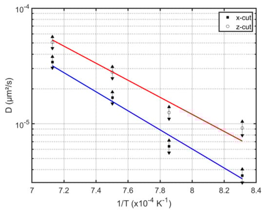With the values for the diffusion depth, the diffusion coefficients D are calculated. The temperature dependence of the diffusion coefficient is given by Equation (7). Figure 5 shows the corresponding Arrhenius plots for the two crystal-cut directions used. By correlating the fitted lines with Equation (7), the values for the diffusion coefficients and the activation energy for the x- and z-direction were obtained. The results are summarized in Table 2.