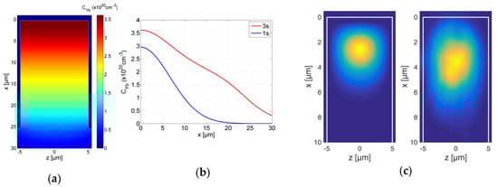 Figure 7c shows the expected intensity distribution of the quasi-TE modes at 800 nm and the intensity distribution measured at 796 nm. It is clearly visible that a good overlap between the Yb profile and the intensity distribution of the mode is achieved. The simulated concentration profiles shown in Figure 7a,b prove that ridge waveguides can be almost homogeneously doped by three-side in-diffusion while avoiding any surface damage that might be caused by exceeding the maximum solubility of Yb in LiNbO3.