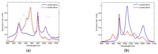 The transmission spectrum of such a 10 µm wide and 2.2 cm long ridge waveguide was measured using unpolarized white light coupled into the waveguide by means of a 40× microscope objective. At the output facet, the transmitted light was collected and coupled into a spectrometer. To measure absorption as a function of polarization, a polarizer was placed in front of the collimator of the spectrometer. The measured absorption spectra (π and σ polarization) show three main peaks at 918, 956, and 980 nm (see Figure 8a), which is in good agreement with the absorption spectra reported for bulk-doped Yb:LiNbO3 [] and Yb:Ti:LiNbO3 channel waveguides []. The losses of the waveguide of 0.8 dB/cm were determined at 1064 nm using the Fabry–Perot method. Fluorescence spectra (π and σ polarization) were measured for pumping with a titanium-sapphire laser at 918 nm. Figure 8b shows the polarized fluorescence spectrum. In agreement with previously reported results for Yb:LiNbO3 waveguides [,], we observed the expected four main peaks around 960, 980, 1008, and 1062 nm.