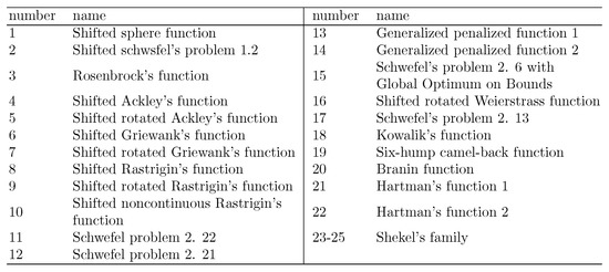 Figure 2 shows the test function used in this paper, with f1, f2, f8, f9, f15–f17 coming from [37], f3–f7, f10, f19 from [38], f11–f14, f20 from [39], f18, f21–f25 from [40].