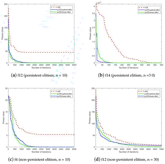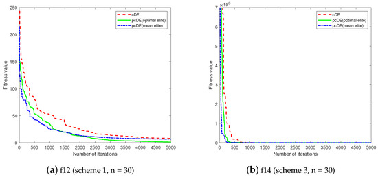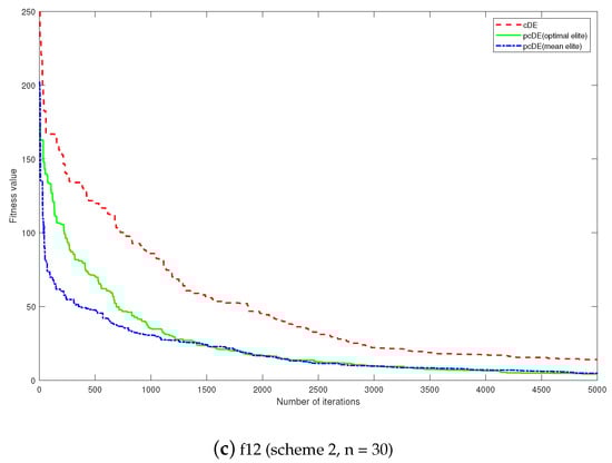 For each test function, we test it with the previously mentioned algorithms. f1–f17 are tested with and ; f18–f25 are tested in the specified dimensions. Each algorithm runs independently for 10 times. The number of parallel groups is set to 3. Each test is performed in iterations. The number of virtual population Np is set as . The mean of 10 independent experiments is used as the experimental result. Table 1 shows the experimental results of two parallel strategies (persistent elitism version, F = 0.1, = 0.1, rand/1/bin). Table 2 shows the experimental results of two parallel strategies (non-persistent elitism version, F = 0.1, = 0.1, rand/1/bin). The best results are highlighted in boldface. From Table 1, we can see that in the 17 tests with n = 10, pcDE achieves the best results of 15 tests, while cDE only achieves 2; when n = 30, the result is the same; in the 8 tests with n = various, pcDE achieves the best results of 6 tests, while cDE achieves only 2. From Table 2, we can see that in the 17 tests with n = 10, pcDE achieves the best results of 16 tests, while CDE only achieves 1; when n = 30, pcDE achieves the best results of 14 tests, while cDE achieves only 3; in the 8 tests with n = various, pcDE achieves the best results of all tests. From the above data, we can see that the performance of pcDE is significantly better than that of cDE. Figure 3 shows the performance trends of pcDE and cDE algorithms. We also test the effects of two communication strategies on experimental results under three different schemes. The three schemes are:1.rand/1/bin, 2.best/1/bin, 3.rand-to-best/1/bin. Table 3 shows the test results, where ‘+’ represents that the performance of the algorithm after parallelism is better than the original algorithm, ‘−’ represents the opposite. Figure 4 shows performance trends of pcDE and cDE algorithms under three different strategies.