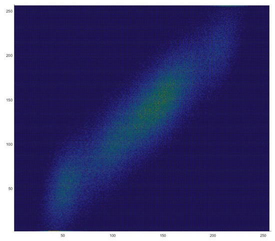 {} is the two-dimensional gray histogram of the image, which is shown in Figure 5. Figure 5 shows that the peak of the probability of the point-neighbor average gray is mainly distributed near the diagonal of the plane, and the overall appearance is bimodal. It is because the target and background account for the largest proportion of all pixels, and the gray value of the pixels inside the target area and the background area are relatively uniform. The gray values of the points are similar to their neighborhood average gray value, so they are concentrated near the diagonal. The two peaks respectively represent target and background. Away from the diagonal, the height of the peak drops sharply. This part reflects the image noise, edges and other information. A two-dimensional histogram XOY plan view is shown in Figure 6. Region A and B correspond to the target and background, and region C and D to the edges and noise. The optimal threshold is determined by the pcDE algorithm to maximize the amount of information that truly represents the target and background.