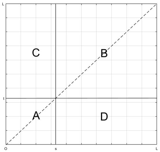 We use the point gray value and neighborhood average gray value to establish a two-dimensional gray histogram F(x, y), then segment F(x, y) with a two-dimensional threshold (s, t). Let be the number of pixels whose gray value is i and neighborhood average gray value is j, be the probability, then
