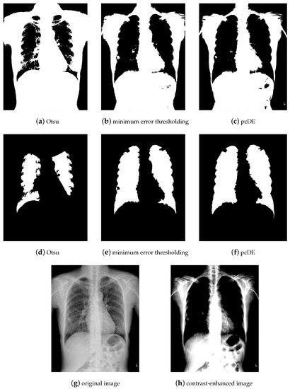 Figure 9 shows the experimental result, in which (a)–(c) are the images after threshold segmentation, and (d) and (e) are the images after morphological processing, and (g) is the original image, and (h) is the contrast-enhanced image. Figure 10 shows the contour marked image. From the above experimental results, we can see that the image segmented via the pcDE algorithm is much closer to the reality, compared with other algorithms.