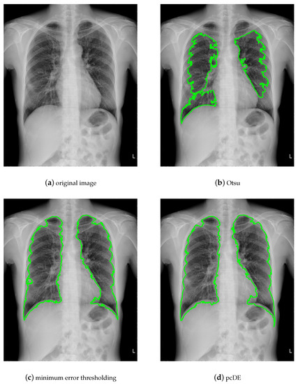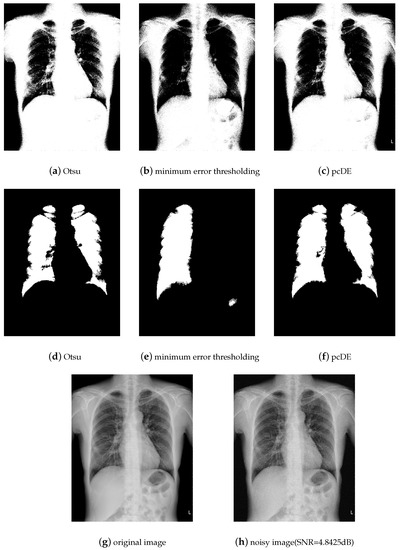Image segmentation is still a hot topic in image processing and computer vision research. The goal of image segmentation is to separate the target from its background, which is the basis of image classification and recognition. Frequently-used image segmentation methods include threshold segmentation, region tracking, and edge detection. The method of threshold segmentation is the most frequently-used image segmentation method. At present, there are many threshold selection methods, like maximum inter-class variance method (Otsu method) [13], best histogram entropy method (KSW entropy method) [14], and minimum error thresholding method [15] etc. Most existing methods use the one-dimensional gray histogram to select segmentation threshold. However, these segmentation methods will cause a lot of errors when the signal-to-noise ratio (SNR) of image decreases. Therefore, the image segmentation method based on a two-dimensional gray histogram appeared. This method is called two-dimensional maximum entropy threshold segmentation [16,17]. It uses gray information and the related information of the neighborhood space, so its effect is significantly improved by comparing with the traditional method. Different algorithms are used to select the segmentation threshold, and the results are analyzed and compared. The analysis of the experimental results shows that the threshold found by the pcDE algorithm is better for image segmentation comparing with some existing methods.