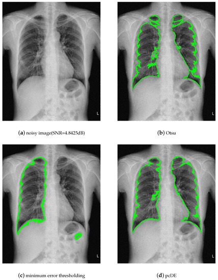 Through analyzing the experimental results, we can see that, in the absence of noise, the minimum error thresholding and pcDE algorithm have a better segmentation effect, with Otsu’s segmentation effect being weak. After that Gaussian noise is added, the pcDE algorithm can still achieve better segmentation effect, while the minimum error thresholding segmentation effect becomes unsatisfactory. Considering the two situations, the pcDE performs better than the other two methods with or without noise, and could be extensive in prospects for application.
