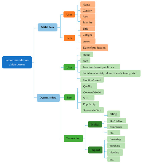 - Static data: Static data are those attributes or features that can be used to learn the utility of recommendations for the user which do not change or take a longer period before they change [28]. Examples of this include, movie descriptions in a movie domain based on their genre attribute such as a thriller, drama, action, and comedy among others, or the actors, director, production date, etc. More information about users, such as the user’s identity, age, gender, and profession could also be exploited as static data to make a personalized recommendation [14].