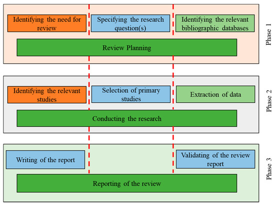 The method adopted for this review paper follows the SLR guidelines specified by [55,56] for systematic literature reviews in Software Engineering. The aim of an SLR is to present a verifiable and unbiased literature review to identify the challenges of the existing studies and to find out the possible research directions to explore in the future. The guidelines mainly consist of three phases, including planning, conducting and reporting of review. Each of these phases and the corresponding activities are shown in Figure 2. The description for each phase is presented in the following subsections.