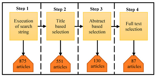 Step 1. The search string is executed on all the aforementioned databases. The sum of all articles searched is 875, and detail of results from all databases is given in Table 2.