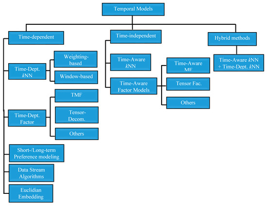 Generally, time information can be used in one of two ways: (1) as context-where time is used as an additional source of information to enrich the prediction model, (2) as time series problem-where data is approached as a chronologically ordered sequence [26]. To this end, the temporal models are broadly classified according to the ways in which time is approached. The models that follow the former approach are termed as time-independent models, while those that follow the later approach are referred to as time-dependent models [26,117]. Figure 6 shows the categories of the temporal models for RS that were identified from the selected studies for this review. Each of these models is carefully studied and a microscopic view is presented in order to analyze the advantage and disadvantages of each model. This will enable us to properly highlight the challenges and future research directions and facilitates better understanding, especially for the novice and the new researchers.