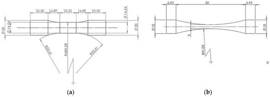 Geometry of the specimens subjected to ultrasonic tests: (a) Gaussian specimen; (b) hourglass specimen (not in scale, dimensions in mm).
