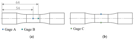 Before the tests, the stress distribution within the risk-volume and the presence of spurious bending loads in Gaussian specimens were verified through a strain-gage calibration. Three strain gages were bonded to a Gaussian specimen: The location of the strain gages (Gage A and Gage B) used for the validation of the stress distribution is shown in Figure 2a; meanwhile, the location of the strain gages used to verify the presence of bending loads (Gage A and Gage C) is shown Figure 2b. It is worth noting that this gage calibration was not carried out on small hourglass specimens, since they have been widely employed and validated in the literature [10,11,12].