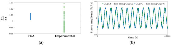 Figure 3 reports the stress-amplitude variation between Gage A and Gage B, computed through Finite Element Analysis (“FEA” in Figure 3) and measured with strain gages (“Experimental” in Figure 3). In particular, the ordinate axis reports the stress amplitude measured by Gage B (sB), normalized with respect to the stress amplitude measured by Gage A (sA). For the experimental data, the stress amplitude was computed through a sinusoidal interpolation of the acquired signal, whereas, for the FEA model, the stress along the gage length (1.5 mm, subdivided in 140 points) was considered. Figure 3b shows the data points acquired with Gage A and Gage C for an input voltage amplitude of 1.4 V (inducing a maximum stress amplitude of about 105 MPa). The acquired data points were interpolated with a sinusoidal function.
