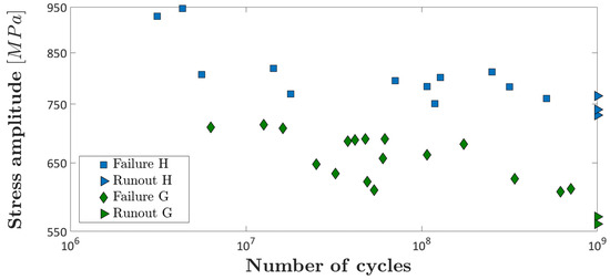 Hourglass and Gaussian specimens were tested in a stress-amplitude range, measured at the specimen half length, scenter, equal to [560:950] MPa. Failures occurred in a range of number of cycles to failure, Nf, equal to [3.13·106:7.08·108]. The fatigue failures originated from a defect, which was experimentally observed by the Scanning Electron Microscope (SEM, Tescan Mira3 FE SEM). As in [9], the stress amplitude close to the defect location, slocal, was considered as the applied stress amplitude during the tests, in order to take into account the real stress originating the fatigue failure. Figure 4 shows the S–N plot of the experimental datasets related to the hourglass specimens (blue square marker) and to the Gaussian specimens (green diamond marker). As for the hourglass specimens, in total, 16 tests were carried out, with 13 failures and 3 runouts. In one case, however, the stress amplitude was not properly controlled during the tests, and it is not considered in the following analysis. Nonetheless, the defect originating the fatigue failure was clearly visible through a SEM investigation, and it was thus considered for the defect analysis. As for the Gaussian specimens, 20 tests were carried out, with 18 failures and 2 runouts. One specimen out of 20 failed before 105 cycles, due to a large surface scratch, and it is not considered in the following analysis.