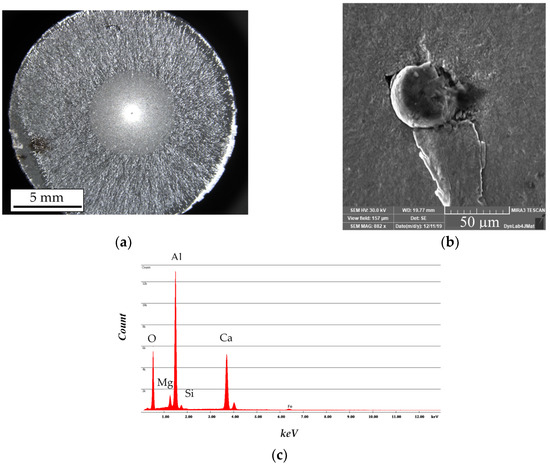 Fracture surfaces and analysis of defects: (a) fish-eye fracture in Gaussian specimen (optical microscope); (b) example of a spherical inclusion originating failure (SEM image); (c) typical EDX spectrum taken at the center of an inclusion originating the fatigue failure.