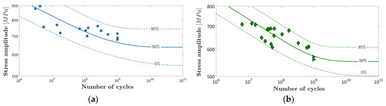 According to [15,16], the finite fatigue life was assumed to be Normally distributed, with mean linearly dependent on the applied stress amplitude and on the defect size and constant standard deviation. The fatigue limit was assumed to be Normally distributed with mean value depending on , whereas the defect size was assumed to follow the Largest Extreme Value Distribution (LEVD), according to [3]. The median, the 0.95-th and the 0.05-th quantiles of the P–S–N curves are shown in Figure 7, together with the experimental data. In particular, Figure 7a,b depict the P–S–N curves for the hourglass and the Gaussian specimens, respectively.