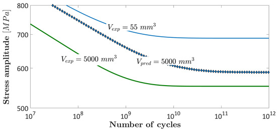 where and are the pdf and the cdf of the experimental defect size and n = V90,pred/V90,exp. Equation (2) permitted to predict for a risk-volume larger than that experimentally tested. It is worth noting that, for n = 1, the tested risk-volume was taken into account, whereas for n > 1, the critical for a larger risk-volume was predicted. By substituting in Equation (1) with , the P–S–N curve as a function of V90,pred was easily obtained. Figure 8 plots the median P–S–N curves estimated from experimental tests on hourglass (Vexp = 55 mm3 in Figure 8) and on Gaussian specimens (Vexp = 5000 mm3 in Figure 8) and the median P–S–N curve predicted by considering the experimental results on hourglass specimens (Vpred = 5000 mm3 in Figure 8).