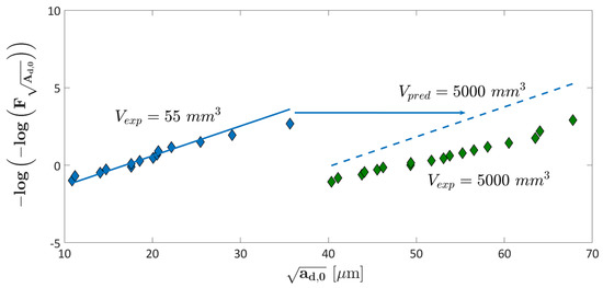 As shown in Figure 8, the predicted P–S–N curve is above the experimental P–S–N curve. By considering the fatigue limit, the difference is about 7%, but it increases up to 14% in the finite life region. This difference is mainly related to the capability of predicting the defect size in large Vpred. Figure 9 shows the Gumbel plot of the experimental dataset, together with the estimated LEVD. The LEVD for Vpred = 5000 mm3 was estimated, according to Equation (2), starting from the LEVD of hourglass specimens.