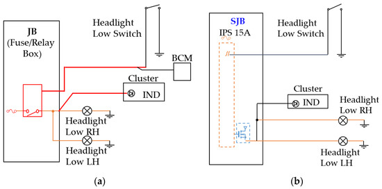 The growing adoption of xEVs has triggered a need for SJBs that can be mounted on xEVs to serve as a stable source of power [21]. However, previous studies have analyzed the results of simulations. In addition, there has been no recent research experimentally verifying the characteristics that can be seen through the manufacture of prototypes. [22,23]. In this study, we implemented a PCB-type SJB that was designed to provide stable power for the low-voltage headlights used in xEVs. A key requirement of automotive electronic systems is reliable power supply to the headlights, which is used for illumination while driving. However, this is not straightforward as the headlights are located in different places in the wiring harness, which changes the respective wiring lengths and resistances the power must traverse. If the SJB did not take this into account, the brightness of the headlights on the left and the right would not be uniform, which would compromise driver safety and may decrease the service life of the bulbs.