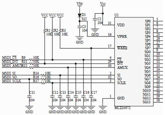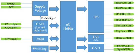A schematic of the implemented SJB is shown in Figure 3. In this design, the PCB module consists of a dual PCB-type arrangement in which the power and control circuits are separate. The components in the system include a 16-bit MCU, a controller area network (CAN) communications controller, a multiple switch detection interface (MSDI) chip, a 9-channel IPS, a low-side driver (LSD) chip for relay control, and a power supply. The IPS was initially configured to supply and control six headlights that consume a large amount of current, although other loads, such as that of wipers, can also be added. The initial six control loads were defined as: Headlight Low (left hand (LH) and right hand (RH)), Headlight High (LH and RH), and Fog (LH and RH). The CAN module provides both low- and high-speed communications buses. The low-speed CAN bus is used for load control communications with the vehicle body control module (BCM) while the high-speed bus is used for communications with other modules, such as an electronic control unit (ECU), in support of load control and diagnostic functions. The purpose of the watchdog circuit is to monitor and reset the MCU when any of the components malfunction and to directly drive the Headlight Low Beams in such instances.
