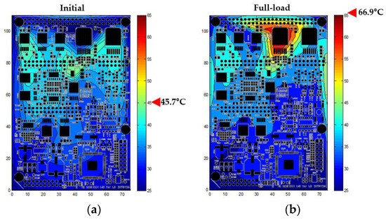 The developed SJB was thermally analyzed by way of a simulation to determine the heat dissipation of the IPS components when driving each load. To analyze the thermal distribution according to the behavior of the SJB PCB module, we used a commercial thermal analysis tool, PADS, and simulated the thermal distribution of the PCB module. An image of the temperature distribution is shown in Figure 7. The results of this analysis showed that under full load operating conditions with both headlights and wipers in operation, the initial maximum temperature on the board was 45.7 °C. The maximum temperature then increased to 66.9 °C when the wipers were set to high power. The temperature rise may be even higher if the SJB were to be installed in the engine compartment of a vehicle powered by an internal combustion engine; however, it is not a concern in this case as the focus of this study is on SJBs for electric vehicles. In the IPS section of the board, the components that experience higher temperatures were placed around the connector to improve the heat distribution to the connector side. In addition, the IPS component that powers the load was placed at the top of the PCB. These measures were considered to satisfactorily address any potential heat-related problems in the SJB.