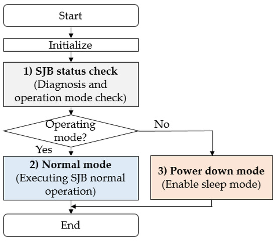 A flowchart describing the operation of the software program is shown in Figure 8. At a high level, the program operates as follows. The software first initializes the SJB and determines the current status. Then, if no error conditions are detected, the SJB switches to normal operating mode. On the other hand, if errors are detected, the software powers down the SJB by placing it into sleep mode. Detailed descriptions of each step are as follows: