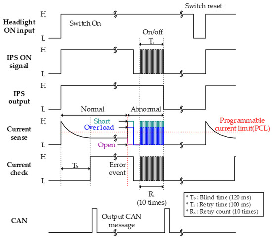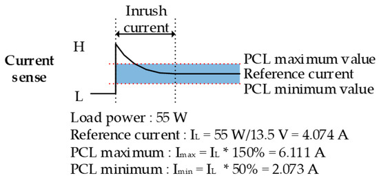 The overload protection function is implemented using a programmable current limit (PCL) that monitors the supply current delivered by the IPS to the load. The range of the PCL is shown in Figure 11 and is based on the steady state current delivered to the headlights and the current handling capacity of the wire. In this implementation, the upper and lower limits of the headlights to be controlled are 150% and 50%, respectively, which in the case of the headlight loads (H/LP Low LH) were 6.111 and 2.073 A, respectively. The software program is designed to monitor the current during operation, and if a PCL limit is detected (i.e., an abnormal condition is detected), the IPS is cycled off/on 10 times to ensure the detected error was valid. If an overload or underload is detected after the 10 cycles are complete, the software program displays an error flag and terminates the IPS.
