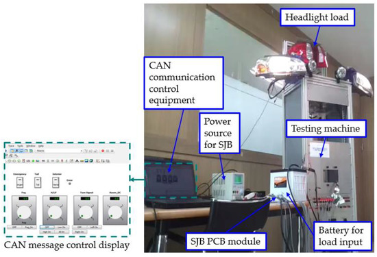 The performance of the SJB when driving the headlights was evaluated using the developed SJB PCB module and the test environment shown in Figure 12. The test environment consisted of an SJB PCB module, a power source for powering the SJB PCB module, a battery for supplying input power to the headlights, CAN communications control equipment, and a testing machine equipped with a headlight.
