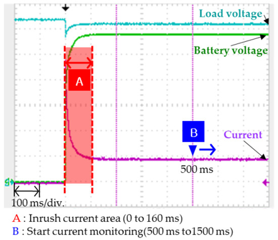 The current was monitored to measure the transient inrush current and steady state operating current. The measured current characteristic of the H/LP High LH output is plotted in Figure 14 in which the inrush current extended from 0 to 160 ms (denoted A in the figure). The root-mean-square (rms) value of the operating current was measured from 500 ms to 1 s after the initial drive start.